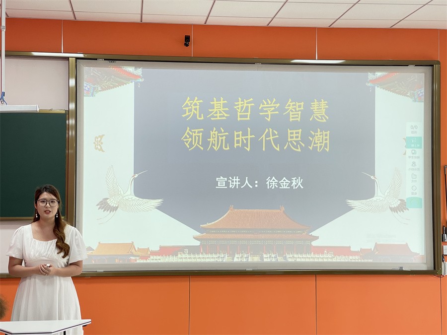蔡涵歆同学以《从新时代十年伟大变革领悟“两个确立”的决定性意义》为题,围绕“两个确立”展开论述,结合实例,深入浅出地阐述了“两个确立”在新时代背景下的重大意义,让在场的同学们深切感受到新时代中国的伟大变革和建设成果,进一步激发了他们的创新意识和作为新时代建设者的责任感。杨文博同学则以《思想的火炬,照耀新时代》为题,高举习近平新时代中国特色社会主义思想的火炬,深入讲述中国共产党自建党以来领导全党、全军、全国各族人民取得的伟大成就,极大地增强了学子们的民族自豪感,激励他们成为德智体美劳全面发展的社会主义建设者和接班人。而徐金秋同学从哲学的角度切入,以《筑基哲学智慧,领航时代思潮》为题,深入剖析了习近平新时代中国特色社会主义思想的世界观与方法论,鼓励学子们筑牢专业理论基础,培养创新思维,将科学理论转化为实践动力。