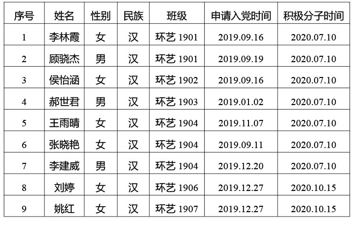 在征求党小组和党员、群众意见的基础上,经支部委员会审查,拟将姚红等9位同志列为发展对象人选。根据发展党员工作有关要求,现将其有关情况公示如下,经党支部培养教育和考察,该同志已基本具备党员条件,在征求培养联系人、党员和群众意见的基础上,经中共北海艺术设计学院建筑与环境艺术学院学生第一支部委员会2022年4月22日讨论同意列为发展对象人选。