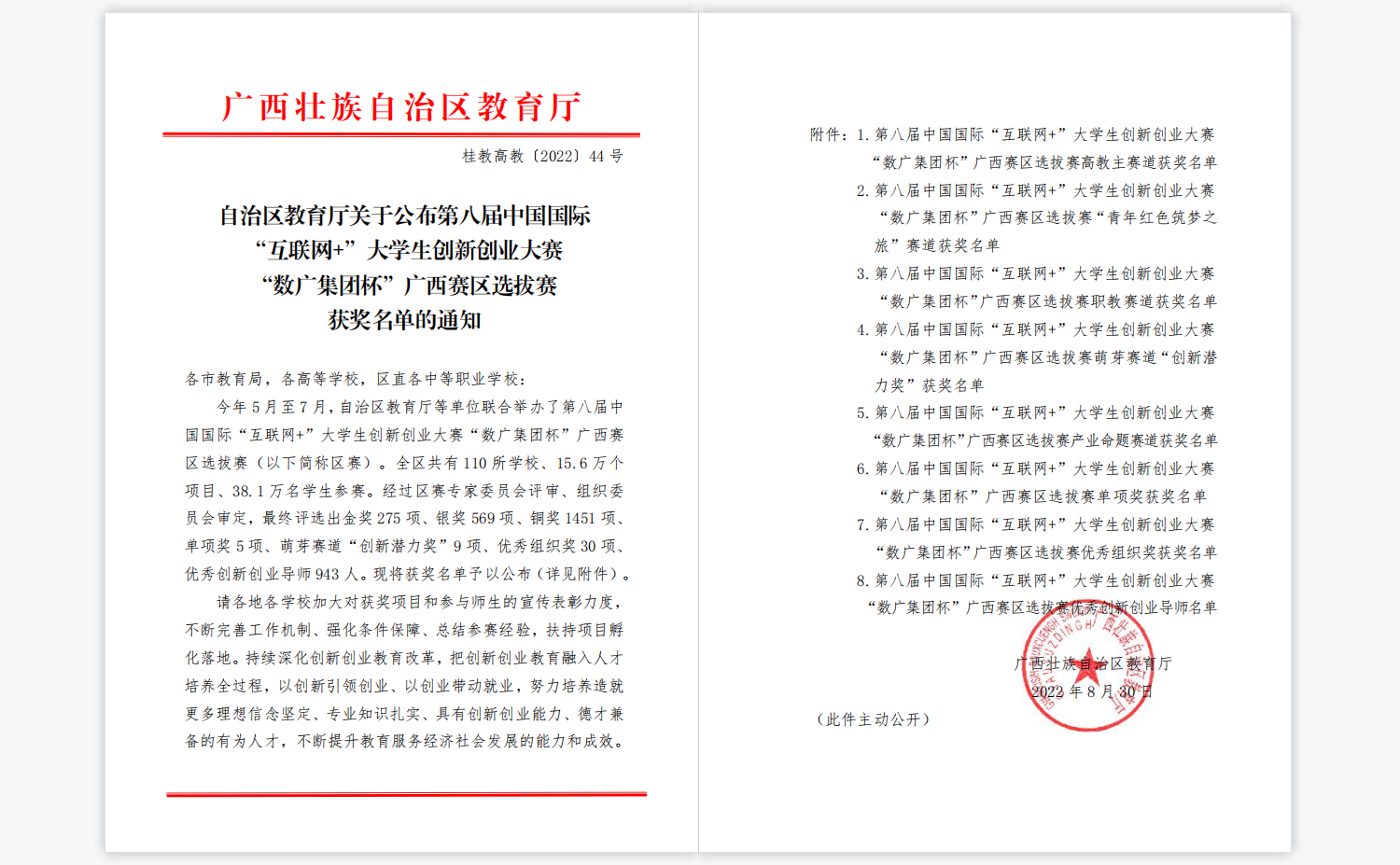近日,广西壮族自治区教育厅发文公布了第八届中国国际“互联网+”大学生创新创业大赛“数广集团杯”广西赛区选拔赛获奖名单,我校共斩获金奖1项、银奖4项、铜奖17项。