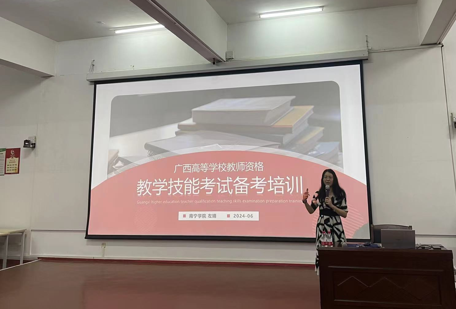 增强我校教师高校教师资格证技能考试应试技巧,提高高校教师资格证技能考试通过率,67下午人事处(教师发展中心邀请广西高等学校教师资格教学技能考试测试专家、FDW国际认证教学技能引导员左婧为我校今年参加高校教师资格证技能考试的教师开展了“高校教师资格证技能考试专题培训”本次培训地点设在西校区伦理楼107,由人事处处长屈志鑫主持,各学院/部门共90余位教师参加本次培训。