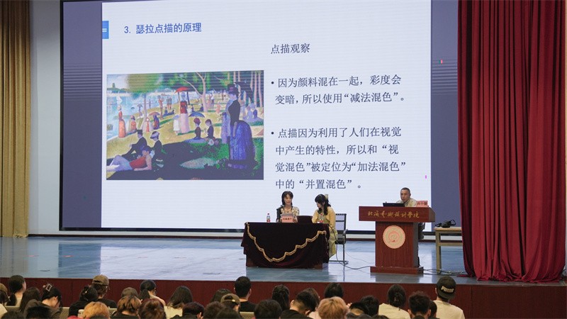 讲座过程中,田森恭子教授通过法国化学家、油脂化学学科开创人谢弗勒尔对色彩心理学产生兴趣的经历,解析了什么是谢弗勒尔的视觉错觉。她指出,在颜色对比中,往往会产生视觉错觉,以致大脑的神经视觉被骗,从而出现同样的颜色被看成不同的颜色现象,并由于背景色不同,颜色会欺骗人的眼睛错觉。随后,田森恭子教授通过介绍法国新印象派画家乔治·瑟拉的绘画用色技法,致力分析谢弗勒尔色彩理论,乔治·瑟拉利用合成“视觉混合”,吸取光学理论,创立了“点描绘画技法”。田森女士还结合丰富的例子介绍色彩在设计实践中的运用,加强学生对专业色彩搭配更直观的感受,加深对色彩的理解,以此引导广大学子进一步学会掌握辨析和运用色彩的能力。