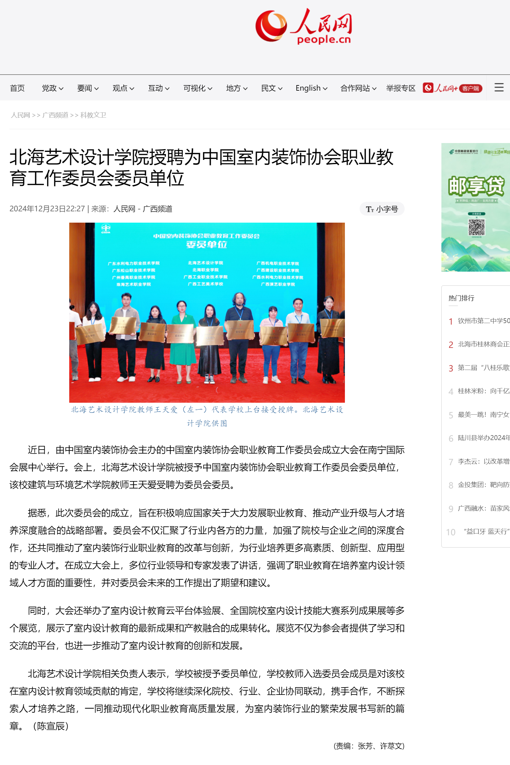 人民网:北海艺术设计学院授聘为中国室内装饰协会职业教育工作委员会委员单位