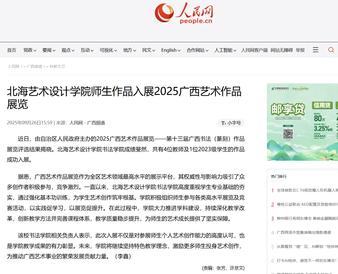 人民网:北海艺术设计学院师生作品入展2025广西艺术作品展览