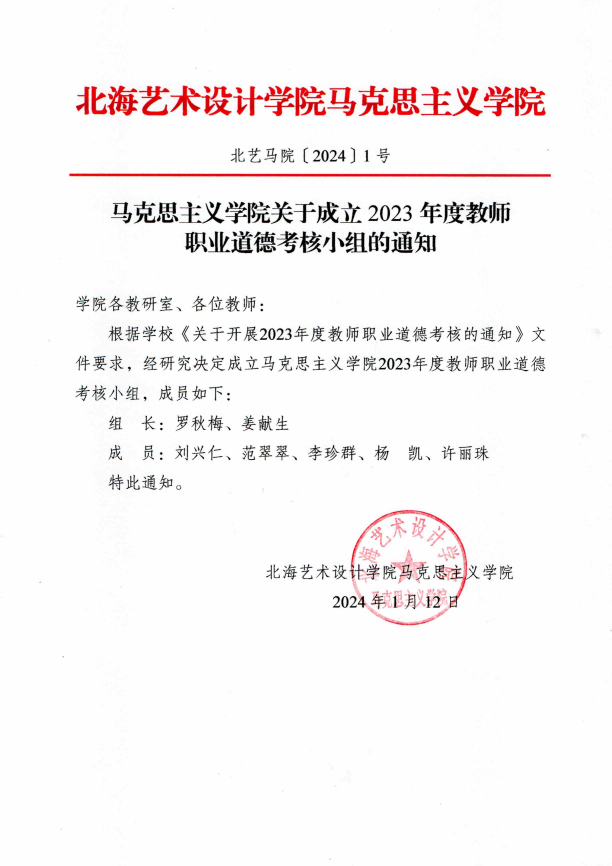 北艺马院〔2024〕1号 马克思主义学院关于成立2023年度教师职业道德考核小组的通知
