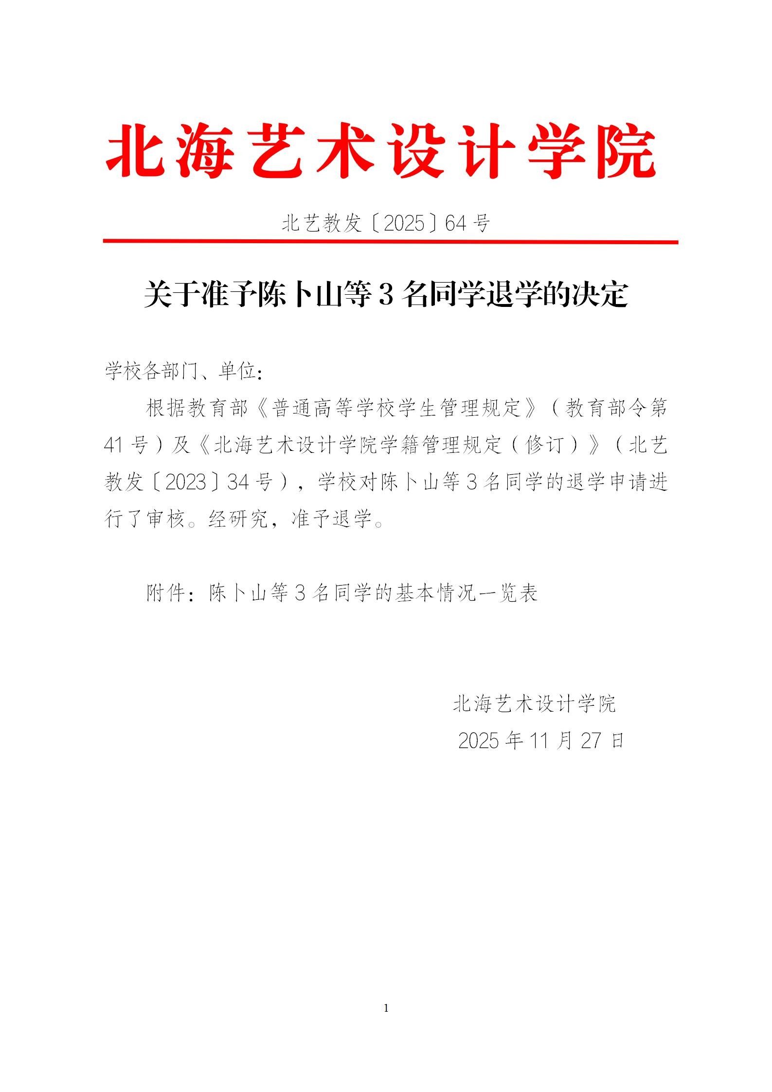 北艺教发〔2025〕64号 关于准予陈卜山等3名同学退学的决定