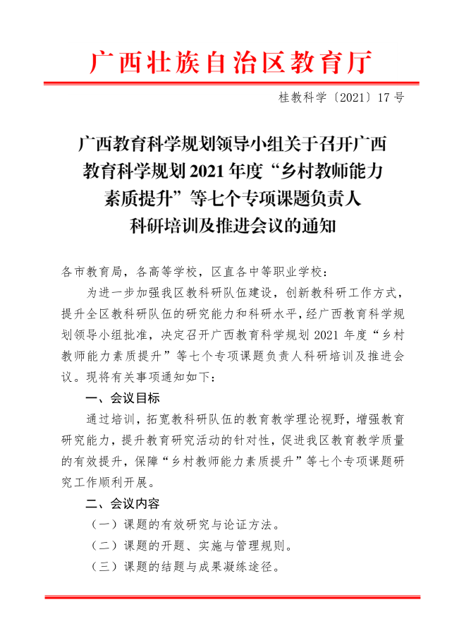 广西教育科学规划领导小组关于召开广西教育科学规划2021年度“乡村教师能力素质提升”等七个专项课题负责人科研培训及推进会议的通知
