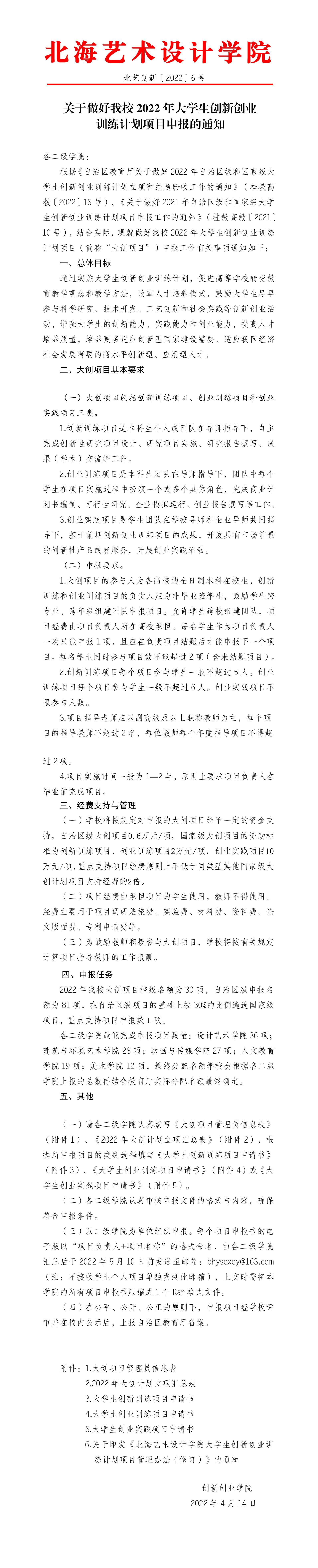 • 附件6:关于印发《北海艺术设计学院大学生创新创业训练计划项目管理办法(修订)》的通知.docx