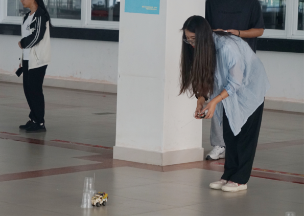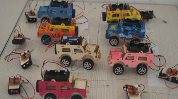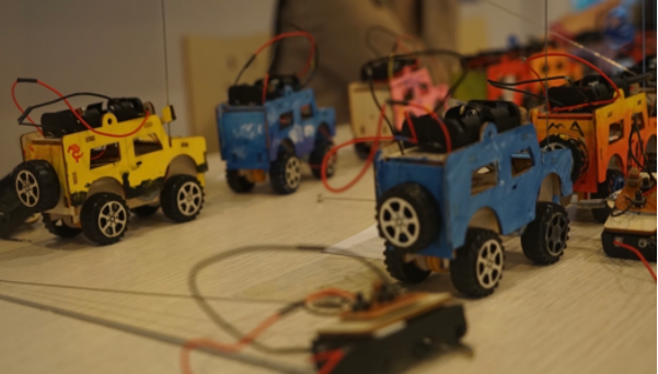 在完成木质小车组装美化赛环节后,选手们由工作人员带领着来到了赛道。每位参赛选手满怀期待的派出他们的“战车”撞击前方的障碍物,将最上方的塑料杯推倒,并遥控小车通过终点,使小车车尾通过终点。比赛进行的十分激烈,现场气氛如火如荼。