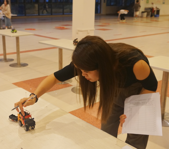 每组比赛完成后都有工作人员对成绩进行测量和统计,每个人的成绩都由统分人一一记录,由评委老师根据小车的美观程度进行打分,活动结束后将记录表统一交到负责人手里。