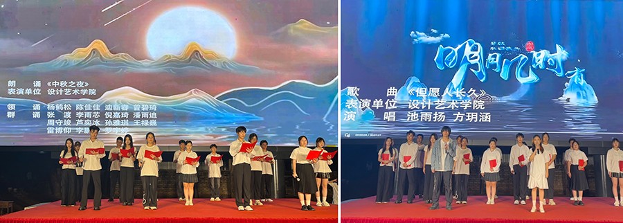 在节目表演环节,我院学生为大家献上诗歌朗诵《中秋之夜》与歌曲合唱《但愿人长久》,不仅为大家带来了精彩的视听享受,也弘扬了我国优秀的传统文化。