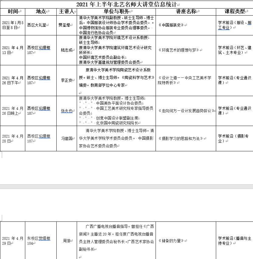 2021年上半年北艺名师大讲堂信息统计
