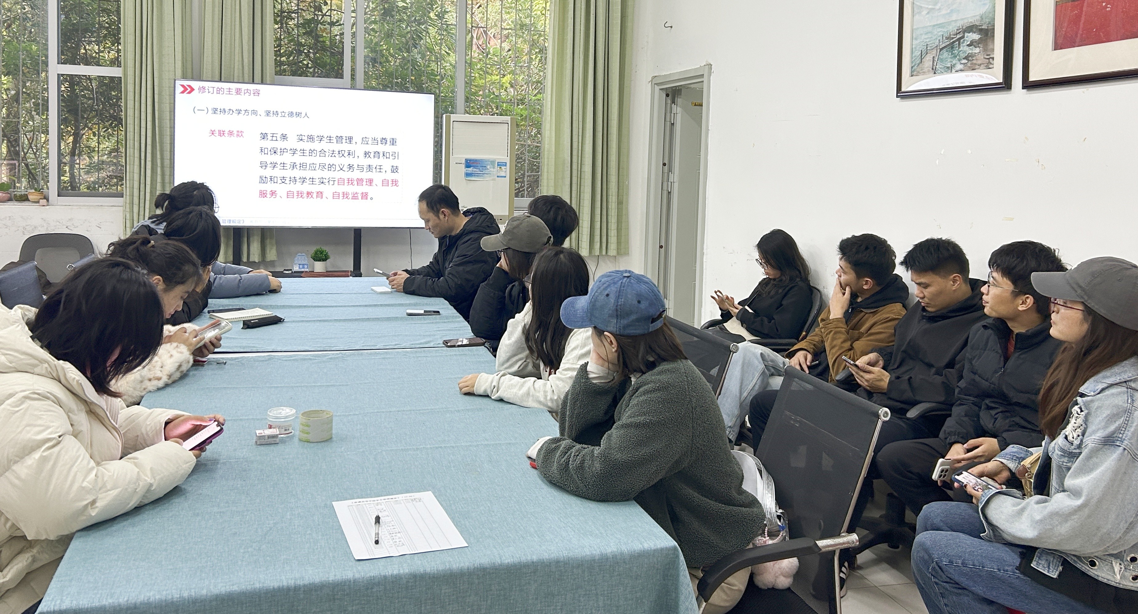 学院学工办精心准备释义与解读资料,助力辅导员深度领会文件精髓,确保在日常管理中精准施策、有章可循。各年级辅导员采用专题会议形式分多个时间段精心组织学习,确保无一人遗漏,有效提升了辅导员对规定的知晓率与参与度。在学习过程中,辅导员们认真聆听、热烈讨论,就如何将规定更好地融入日常管理工作各抒己见,形成了良好的学习氛围。