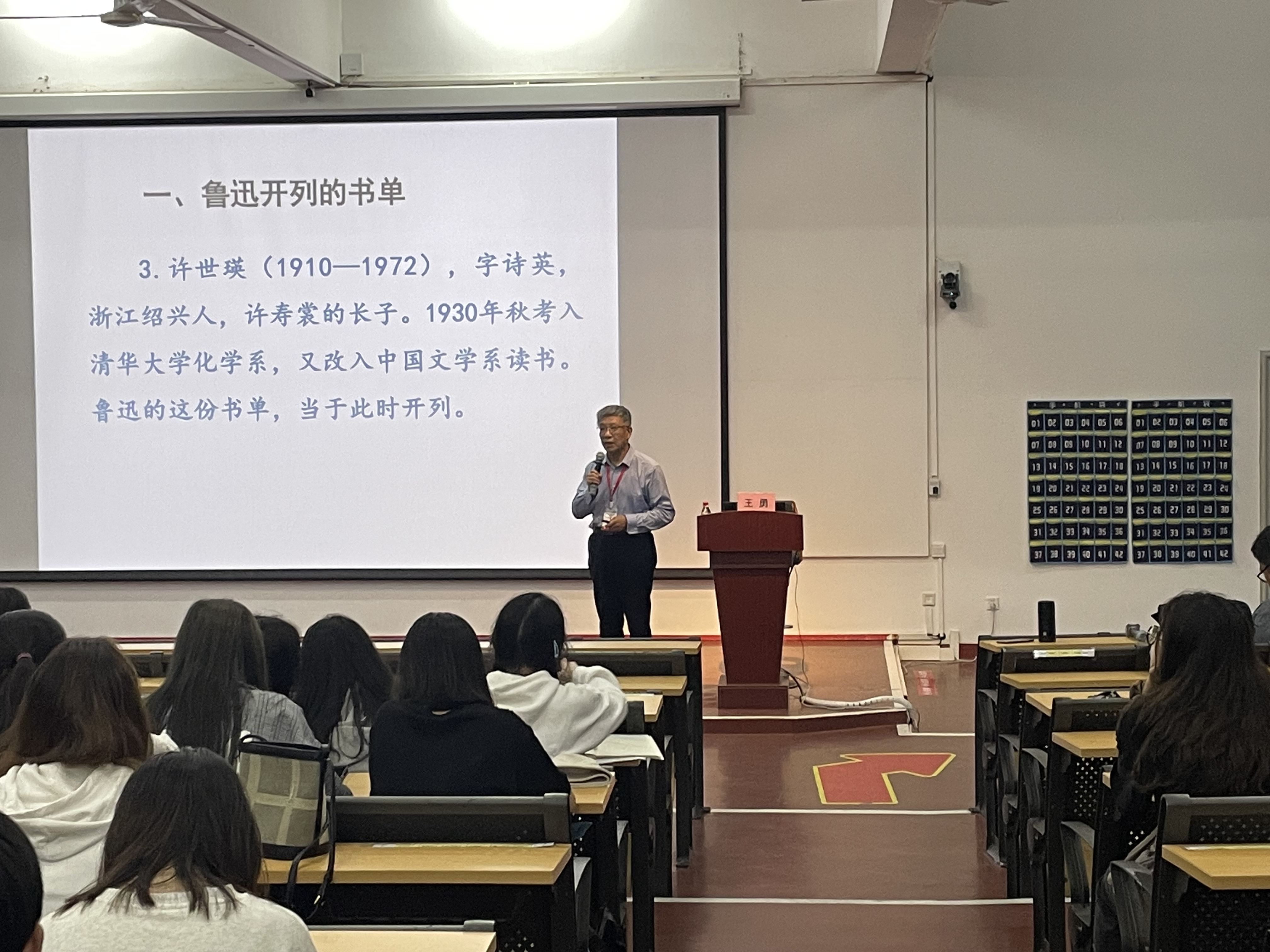 王勇教授首先从鲁迅开列的具体书籍谈起,细致独到地讲授了书单中的《唐诗纪事》《唐才子传》《世说新语》等12部书籍,王教授讲解鲁迅列此书单的用意,是为了使同学们明白阅读应当具有选择性。