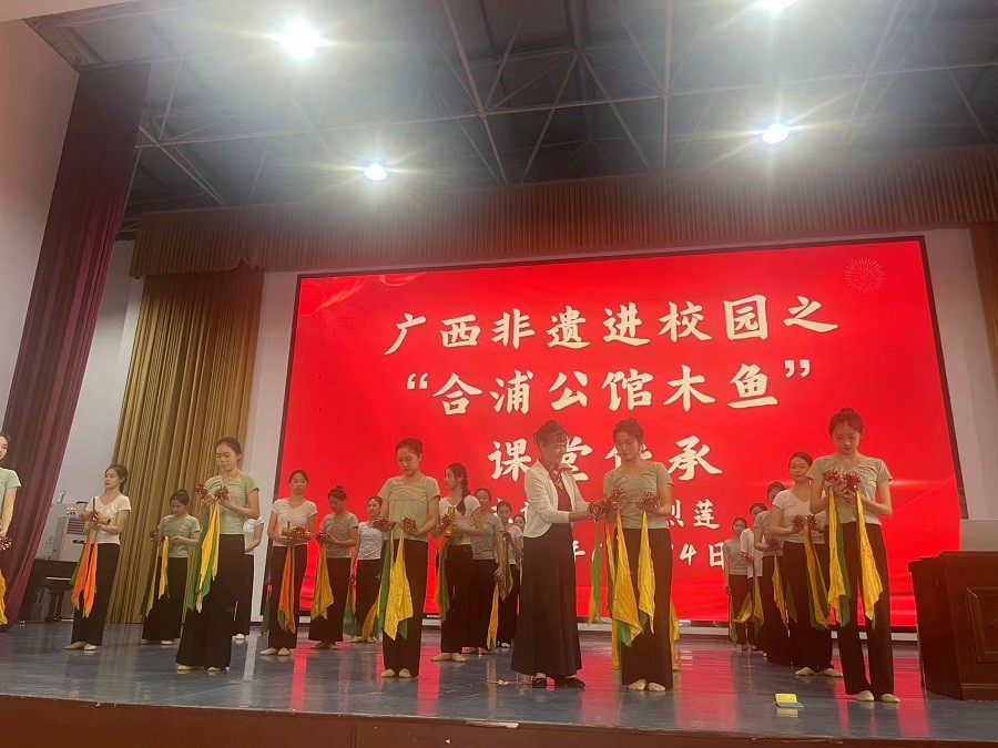 采风考察第一天,我们特别邀请了广西非物质文化遗产“合浦公馆木鱼”第四代传承人 、广西戏剧家协会会员、原北海市戏曲家协会副主席、合浦县金牡丹艺术团团长,廖烈莲。她把广西非遗之“合浦公馆木鱼”课堂的教学与实践体验相结合,让舞蹈表演专业的学生们深入了解并传承这一独特的非物质文化遗产。