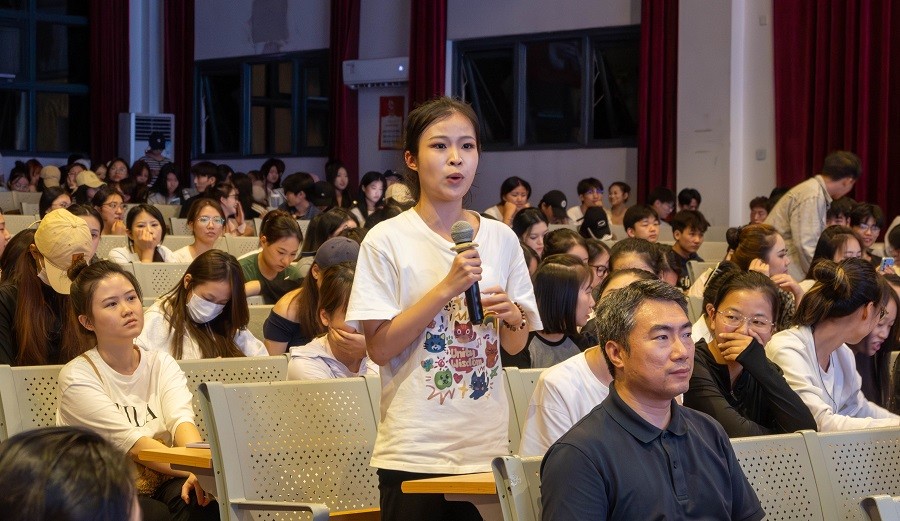 在师生互动环节,现场学生踊跃提问,围绕广西壮族舞蹈的编创、传承以及舞台化展演等话题与覃海教授展开交流。覃海教授耐心一一解答了关于壮族舞蹈文化内涵与现代化表达的疑问,并分享了其田野调研中的感悟,鼓励学生关注民族舞蹈的多样性和创造力。现场互动气氛热烈,思想的碰撞为学生提供了深入了解广西壮族舞蹈艺术的新视角。