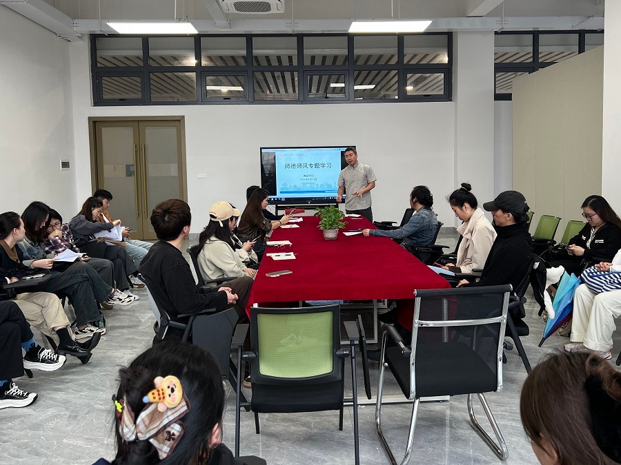 会上,党支部书记宋慧敏传达上级关于师德师风建设的文件精神。强调习近平总书记关于教育的重要论述是新时代教育工作的根本遵循。重点解读了《新时代高校教师职业行为十项准则》,要求全体教师要树立纪律和红线意识,严格落实师德师风建设的规范和要求。关于《最高人民法院 最高人民检察院 教育部印发关于落实从业禁止制度的意见的通知》,党支部书记宋慧敏强调,学院将严格排查,确保教职工无违规从业情况,强化入职审查,把好入口关,守护校园安全。