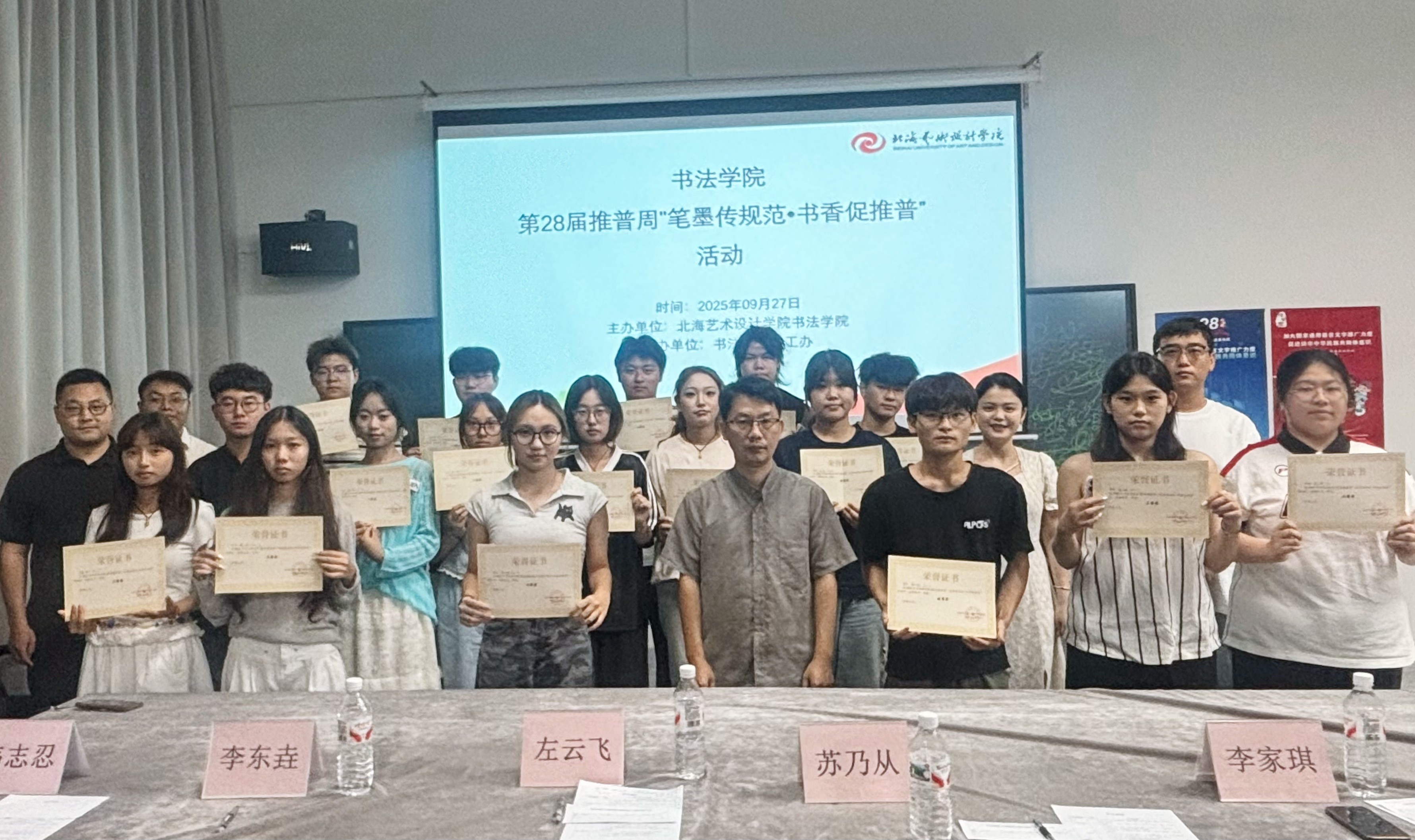 为加大国家通用语言文字推广力度,促进铸牢中华民族共同体意识,书法学院于9月19日至26日组织开展推普活动,并于9月27日在南校区艺德楼507书法教研室举办“笔墨传规范·书香促推普”宿舍规范汉字书写比赛暨推普成果展示活动。学院常务副院长苏乃从、党支部副书记左云飞,以及副院长李东垚、李家琪、黄荣婷、韦志忍共同出席并担任评审。