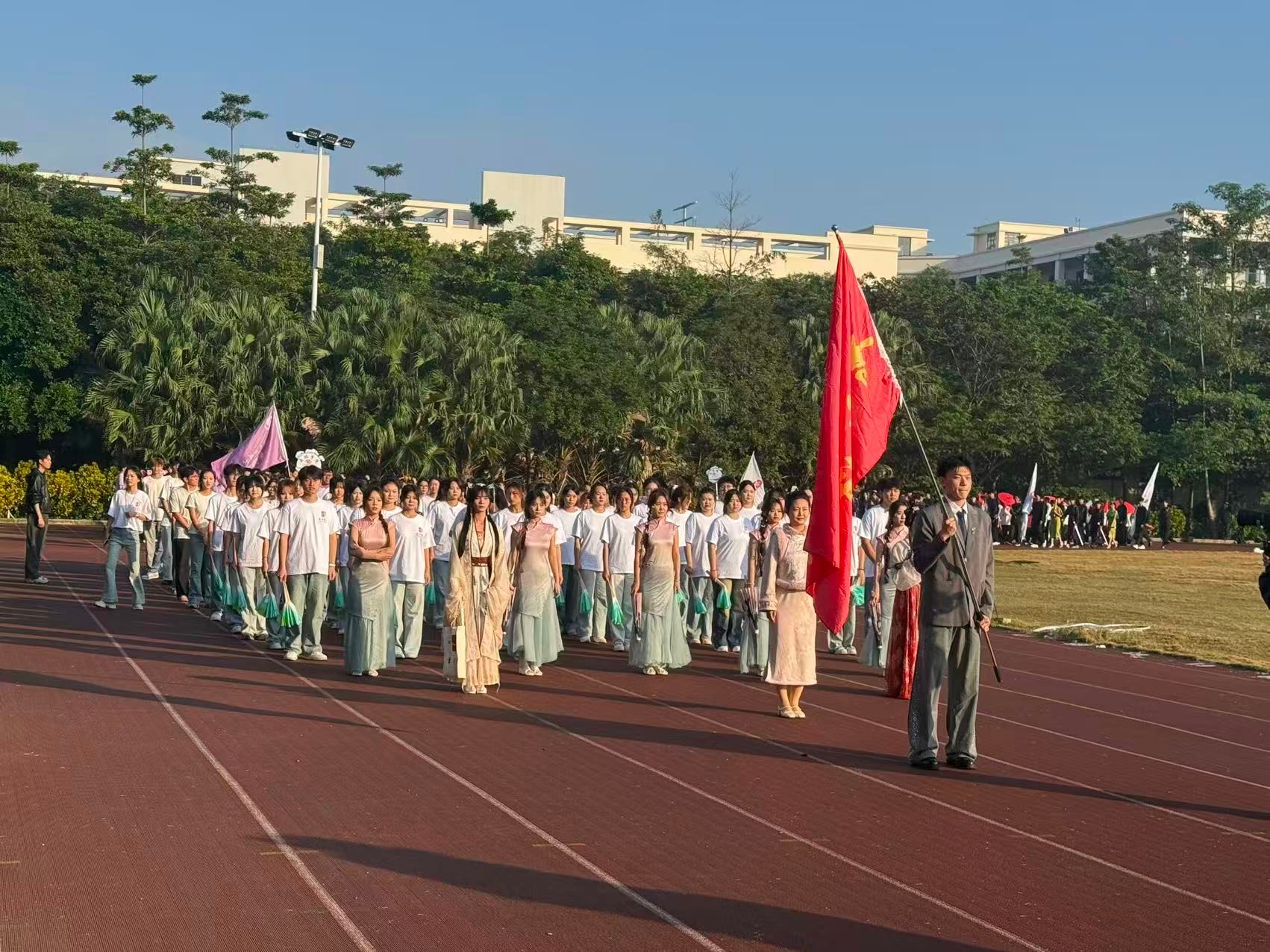 开幕式在庄严的国歌声中拉开序幕。国旗护卫队步伐整齐,护送国旗入场。伴随着国旗升起,各学院运动员方阵依次进场。书法学院学生方阵以饱满的精神、整齐的步伐展现了学子昂扬的朝气,学生代表献上团体表演,彩旗飘扬、鼓号激扬,共同汇成一场洋溢着青春活力的开幕式画卷。