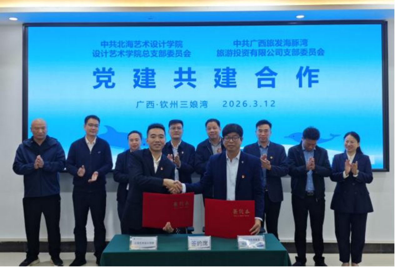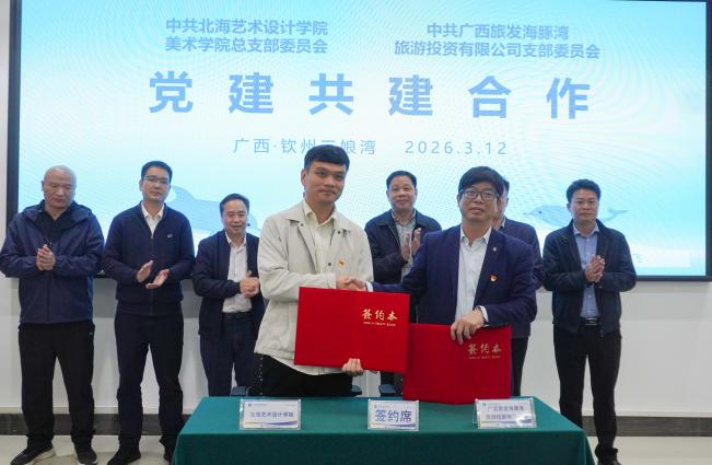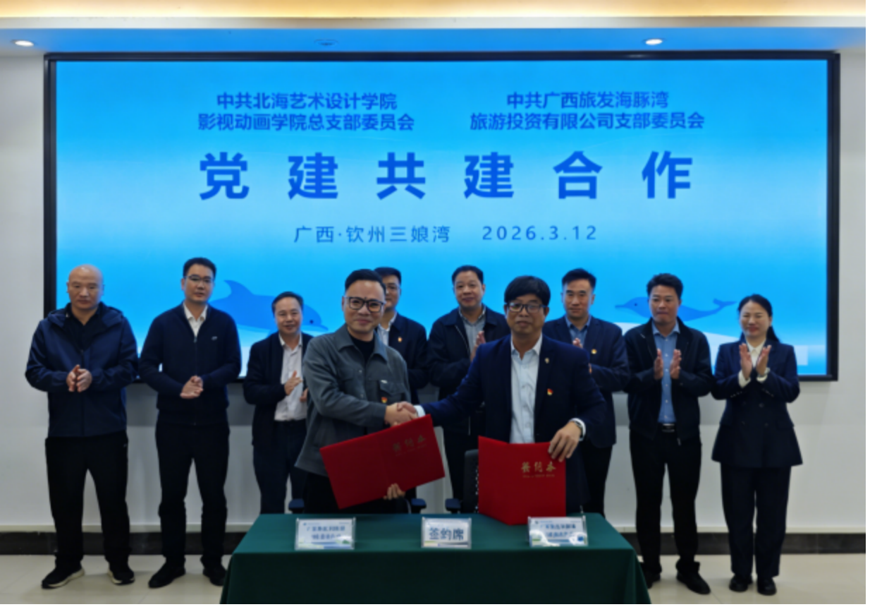 在各方嘉宾的共同见证下,校企双方举行隆重的签约仪式。北海艺术设计学院与广西旅发海豚湾旅游投资有限公司签署校企合作协议,广旅海豚湾党支部还分别与学校美术学院党总支、影视动画学院党总支、设计学院党总支签署党建共建协议,四份协议的签署标志着校企双方正式建立深度合作关系,在党建联建、产教融合、专业实践、人才培养等领域开启协同发展新篇章。 签约仪式后,校企双方围绕“党建+海洋开发利用和保护+专业实践”开展专题交流研讨。双方党员代表结合中华白海豚生态保护、文旅项目党建赋能、校企协同育人等核心话题,分享党建工作经验,交流合作思路,就如何将学校写生、文创、短视频专业优势与海豚湾公司“出海寻豚”文旅IP深度结合,推动文创产品开发、短视频宣传推广、研学实训基地建设等具体合作事项展开深入探讨,进一步凝聚了党建共建、产教融合的合作共识,强化了党员服务产业发展、助力人才培养的责任担当。 随后的总结寄语环节,校企双方代表对本次活动成果进行梳理,明确了后续党建联建活动开展、出海寻豚项目实训合作落地、文创开发与宣传推广推进等具体计划,达成了构建长效合作机制的一致共识,全体参会人员合影留念,定格校企携手的重要时刻。