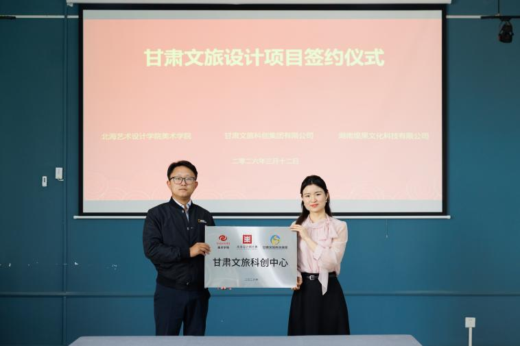 2026年3月12日,美术学院甘肃文旅科创集团签署合作协议,并举行“甘肃文旅科创中心”授牌仪式。签约仪式上,甘肃文旅科创集团负责人向我院授牌,正式成立“甘肃文旅科创中心”。根据协议,双方将建立常态化设计需求对接机制:甘肃文旅科创集团将定期梳理省内文旅场景在视觉形象优化、文化创意衍生、空间艺术提升、数字交互体验等领域的共性需求,形成课题方向发布至美术学院我院将依托自身摄影、美术学、绘画、雕塑等学科的优师资力量,通过写生采风、毕业设计、专题工作坊等形式开展定向创作与课题研究,为甘肃文旅资源转化提供创意储备。