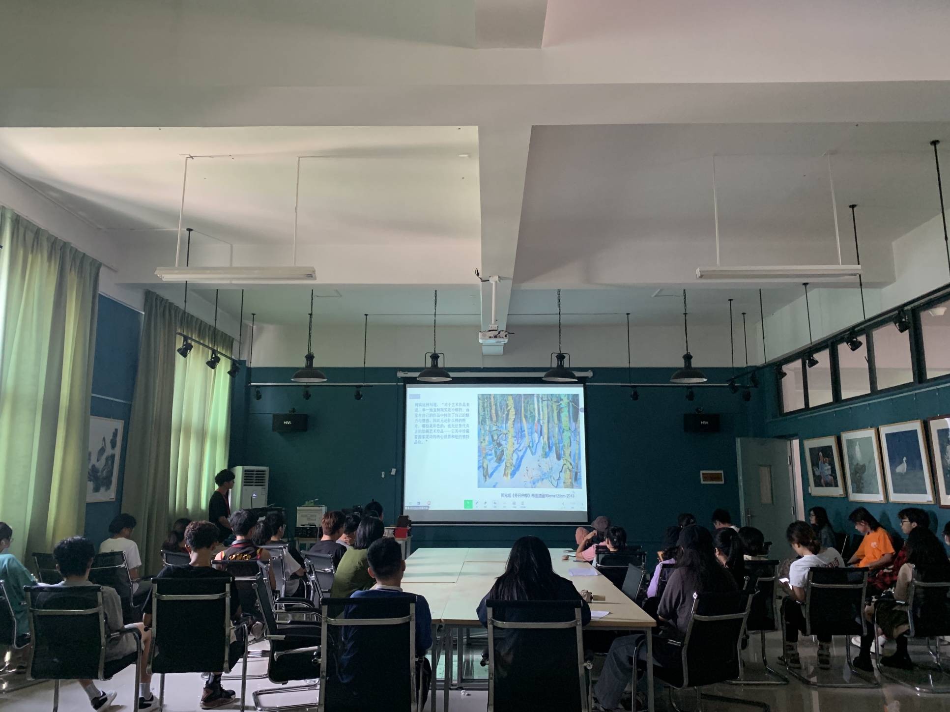 郑光旭老师以个人作品与学习经历作为背景,以绘画创作的过程为线索,对其中目的与方法进行分享,以及三者之间相辅相成的紧密关系进行探讨。郑光旭老师指出“真实的再现不等于现实的复制”。鼓励学生在绘画创作中寻找感受,带着感受去选择绘画客体,从而探寻其本质及创作的基本方向与富有创造性的精神生产生活。