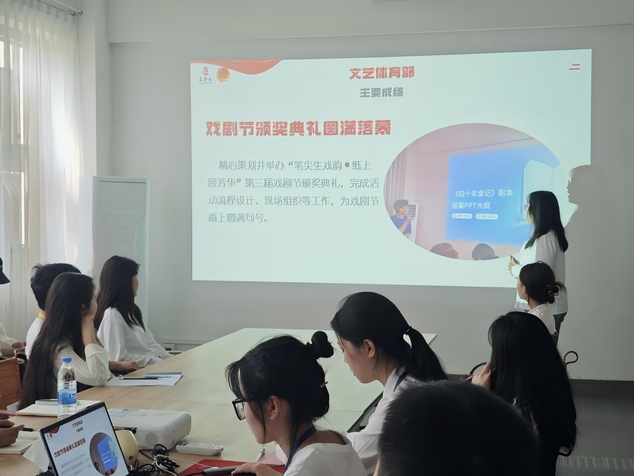 紧接着,分团委学生会各部门代表分别围绕工作成果、特色亮点、问题反思、未来规划四大核心方面依次上台进行述职汇报。全面回顾本阶段在学风建设、校园活动、志愿服务、新媒体宣传、部门协作等各项工作中的具体举措与实绩,细致梳理特色做法与成功经验,同时坦诚剖析工作中存在的短板与不足,并结合学院特色与学生需求,制定切实可行的未来工作计划。整场述职汇报条理清晰、内容详实、实事求是,充分展现了文学院学生干部务实肯干、善于反思、积极进取的精神风貌,也呈现出分团委学生会阶段性工作的成效与思考。