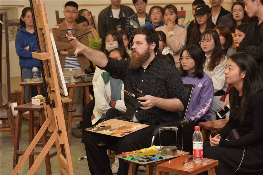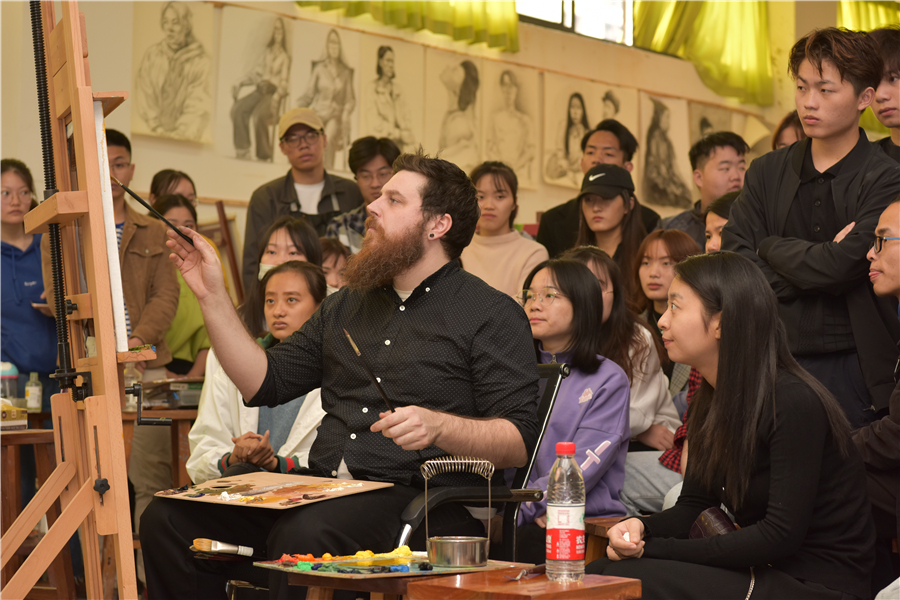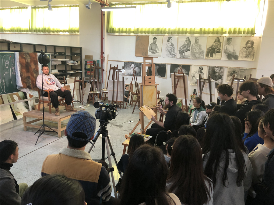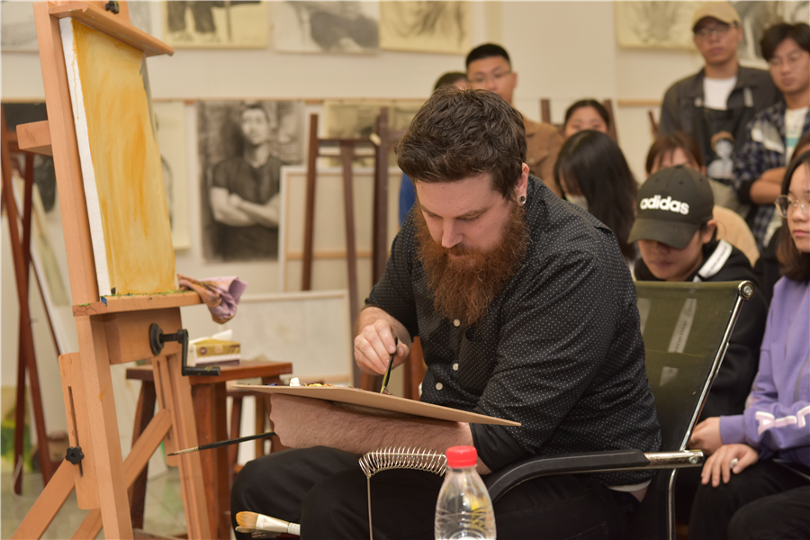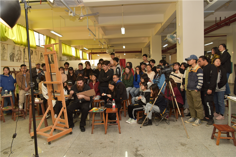 12月12日,美国芬兰迪亚大学艺术学院绘画系主任迪伦在美术学院绘画教室开展人像写生示范,现场吸引了许多师生前来积极观摩学习。