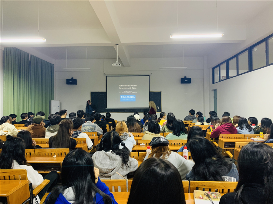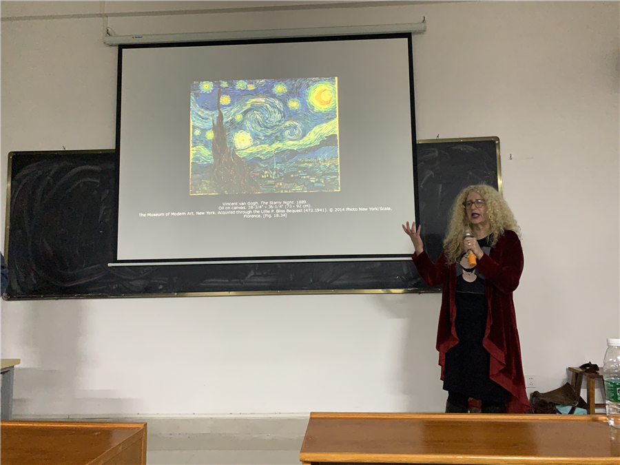 晚上7:30分,美国芬兰迪亚大学艺术学院院长丹尼斯莅临我校美术学院艺术楼314讲授《西方美术简史》课程,现场座无虚席。丹尼斯院长介绍了西方的代表画家作品,并多角度、全方位地对西方美术史进行解读。